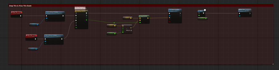 For this prototype, my main focus was building the system that makes my game unique, which is the dropping tiles. I started from the ground up, creating the tile blueprint itself. That meant assigning materials, getting the tile to drop on command, and then rising back up. This was essentially the tile cycle.